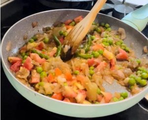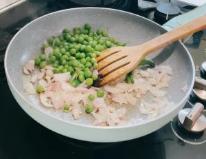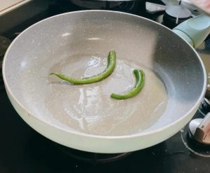 - Add slit green chilli and peas, and sauté until peas are tender.