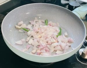 - Heat oil in a pan. Add chopped onions and sauté until translucent.
