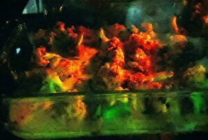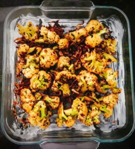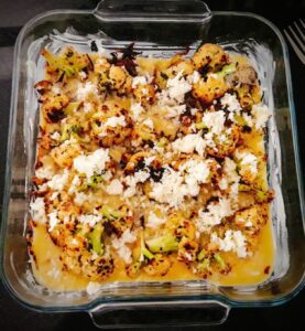 If your skillet is oven-proof then you can use it directly to bake. Then add the chopped garlic and the roasted cauliflower florets, add the chilli flakes and the dry fenugreek leaves and sauté for a few minutes.