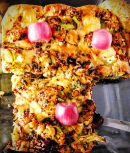 Fusion cooking is interesting when it mingles the right ingredients. A frittata is essentially Italian but I’ve used a lot of Indian spices and to be honest, it does taste rather good. I used Kasuri methi or dry fenugreek leaves to season the frittata and garnished it with vinegar-soaked onion slices.
