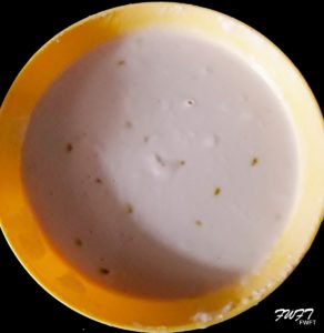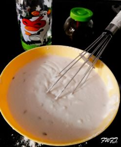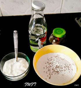 Firstly, make the batter by mixing all the dry ingredients together;; plain flour, rice flour, salt, baking soda, and cumin seeds. Next, add yoghurt mix well.